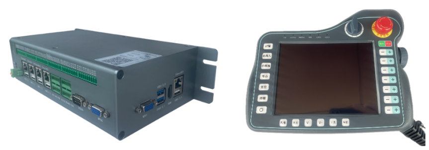 自研鸿蒙机器人控制器——搭载自研国产机器人操作系统(左),自研鸿蒙智能示教编程器(右)