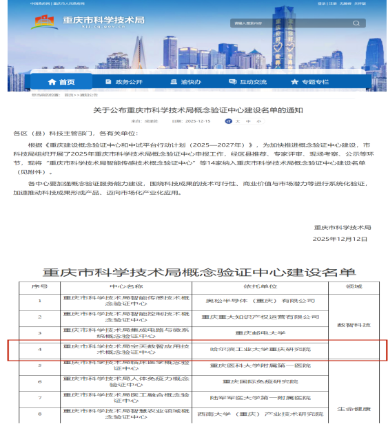 近日,重庆市科学技术局公布2025 年概念验证中心建设名单,哈尔滨工业大学重庆研究院(以下简称 “哈工大重庆研究院”)成功入选,成为空天数智应用技术概念验证中心建设依托单位,为持续提升重庆科技成果转化效能注入澎湃动力。