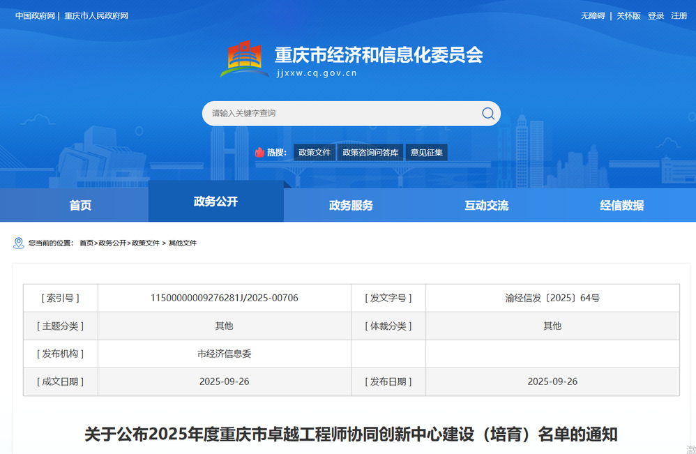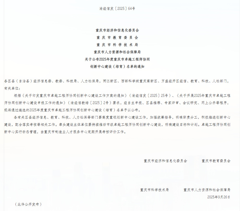正式公布2025年度重庆市卓越工程师协同创新中心建设(培育)名单:https://jjxxw.cq.gov.cn/zwgk_213/zcwj/qtwj/202509/t20250926_15044862.html