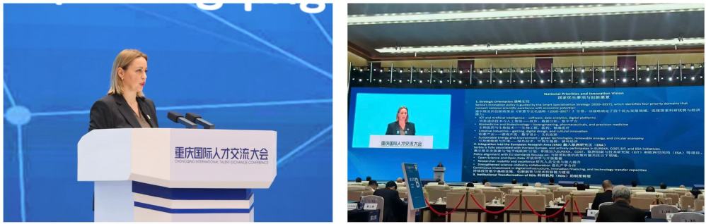 11月15日上午,塞尔维亚科学、技术发展与创新部国务秘书玛丽亚·格尼亚托维奇女士在2025重庆国际人才交流大会开幕式上发表主旨报告,介绍了塞尔维亚在科技成果转化方面的实践,并重点肯定了研究院牵头建设的中国(重庆)—塞尔维亚技术转移中心在推动双边合作中所取得的进展。她向全球科技人才与机构发出邀请,期待进一步拓展国际合作新空间。