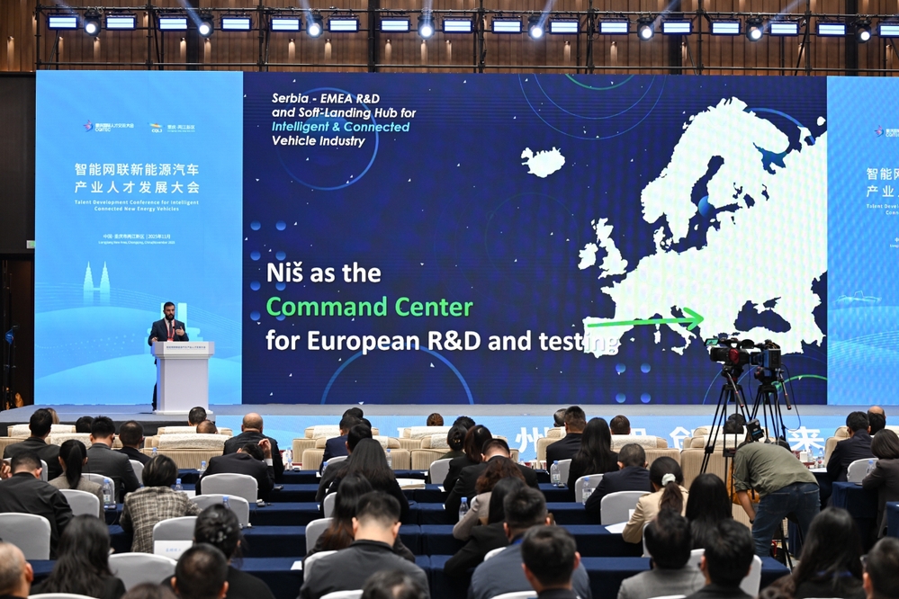 11月15日下午,塞方代表团参加由重庆两江新区、重庆市经信委、中国汽车工程学会主办,研究院协办的“智能网联新能源汽车产业人才发展大会”专场活动。塞尔维亚尼什科技园负责人伊万·帕夫洛维奇先生聚焦国际投资新机遇,重点推介智能网联新能源汽车“一带一路”(塞尔维亚)产业投资机会。他表示,塞尔维亚正着力推动产业升级,将智能网联新能源汽车作为重点发展领域,并已为此营造了优良的投资环境,期待与中国企业在该领域开展深入合作。