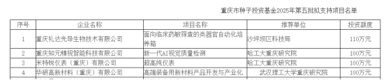 根据重庆市科学技术局于2025年12月11日发布的《关于重庆市种子投资基金2025年第五批拟支持项目的公示》,我院孵化的两个项目 —— 重庆知元精视智能科技有限公司的“新一代 AI 视觉质量检测项目”和米特锐仪表 (重庆) 有限公司 的“超高纯仪表项目”,凭借突出的技术创新性与市场应用潜力,各获得重庆市种子基金100万投资,将为项目发展注入强劲动力。